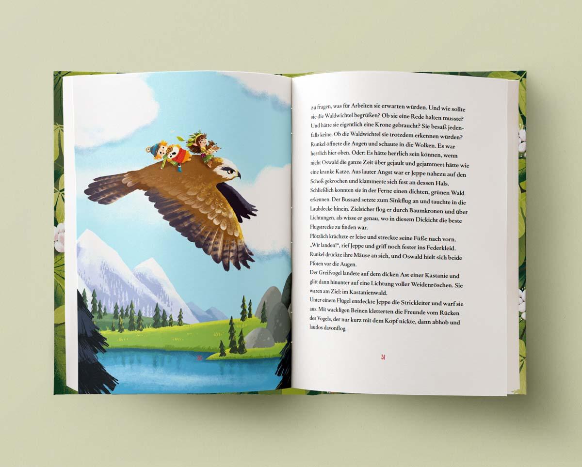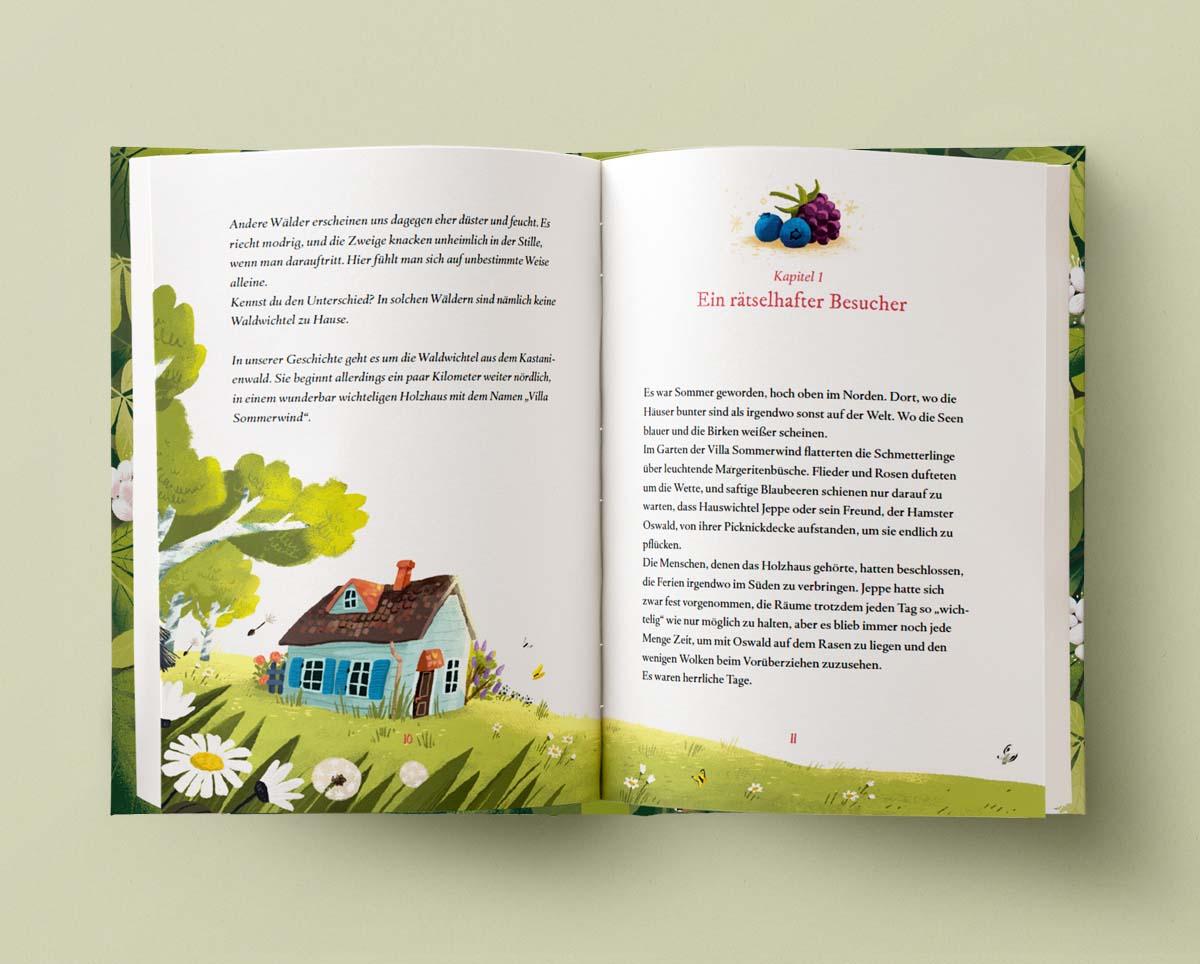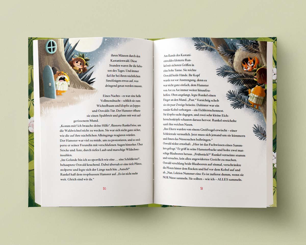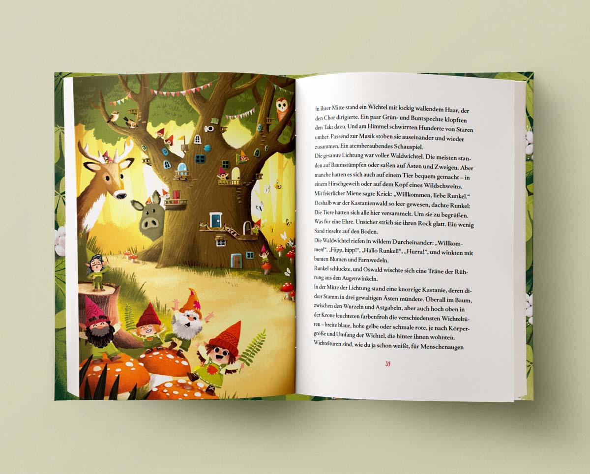 Aufgeregt machen sich Runkel, Jeppe und Oswald auf zum Kastanienwald, um gemeinsam mit den Waldwichteln alle Aufgaben zu übernehmen, die kurz vor dem Herbst so anstehen: das Moos bürsten, Blattmuster entwerfen, Blätter bemalen und für einen angenehmen Raschelton sorgen.